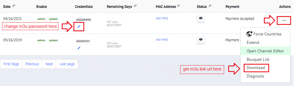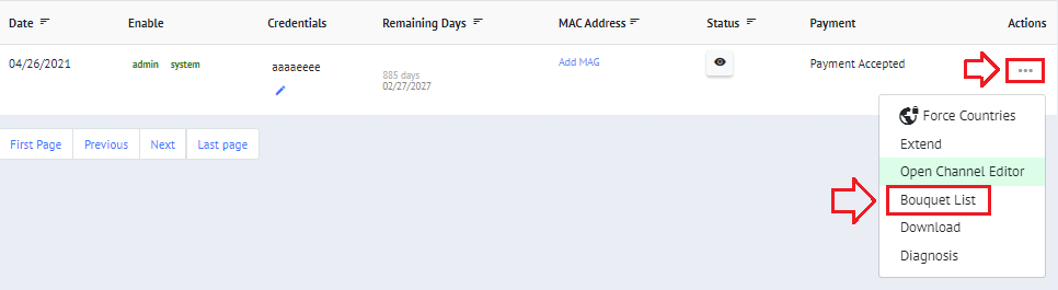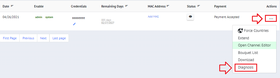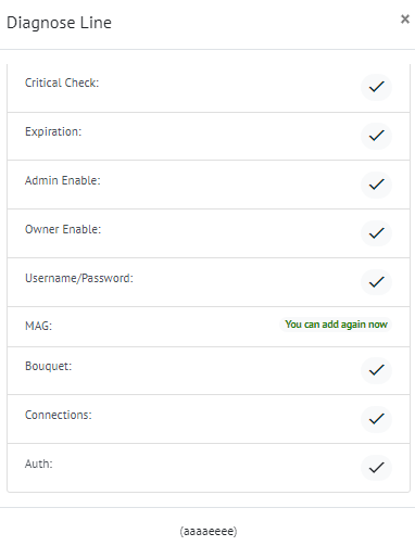 Open the left menu: Manage/Extend Lines => Actions > Diagnosis. You can find it at: http://mr.iptv.uno/dashboard/manage-lines