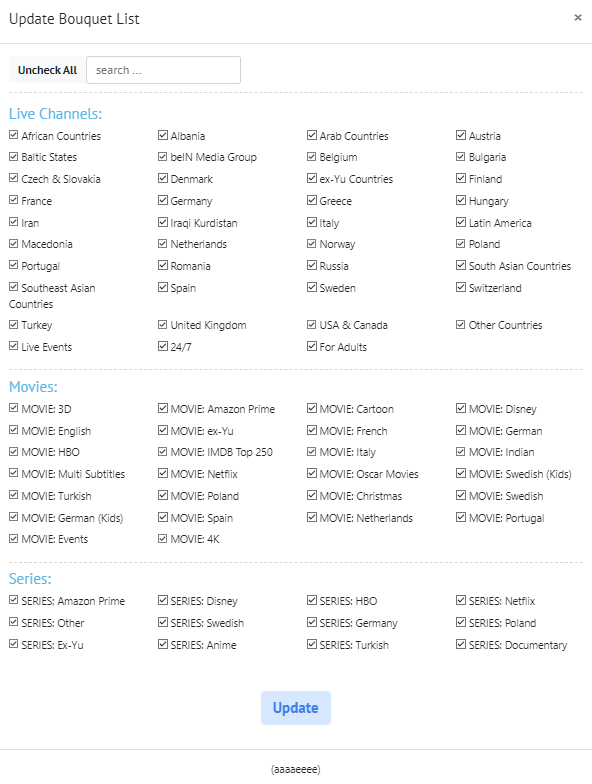 Select the Country/Groups you like, or remove those you don’t wish to see. Your http m3u link URL will automatically update with the new sources from the Bouquet List.